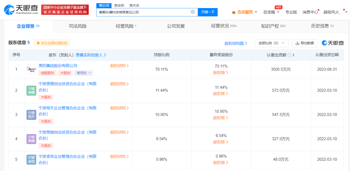 该公司成立于2020年10月,法定代表人为马赤兵,注册资本5000万人民币,经营范围包括智能机器人的研发、家用电器制造、人工智能应用软件开发等。股东信息显示,该公司控股股东为美的集团(000333),持股约70.11%。