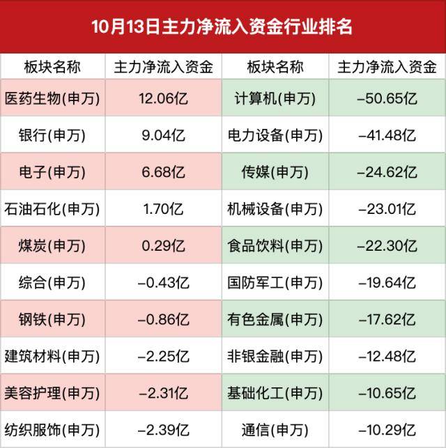 资金流向上,主力净买入前三的是医药生物、银行、电子行业板块,分别获得主力资金净买入12.06亿元、9.04亿元、6.68亿元。遭主力净卖出前三的是计算机、电力设备、传媒行业板块,分别净卖出50.65亿元、41.48亿元、21.62亿元。