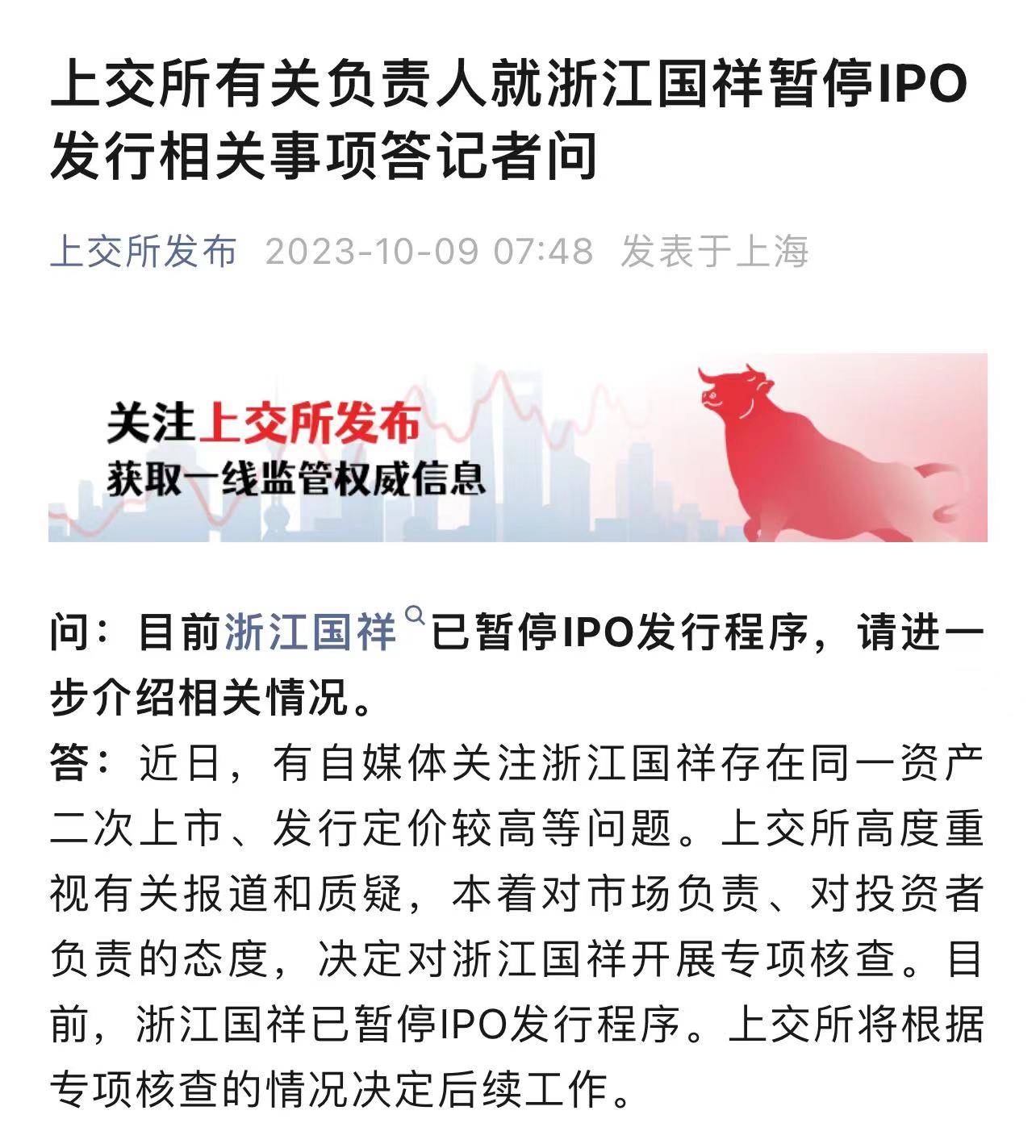 10月7日,浙江国祥股份有限公司(以下简称“浙江国祥”)发布公告称,因有关媒体报道,为切实保护投资者利益,发行人及主承销商决定暂停后续发行工作,待有关事项得到核实与澄清后再继续发行工作。原《发行安排及初步询价公告》中披露的预计发行时间表将进行调整,原定于2023年10月9日(T日)进行的申购暂缓。