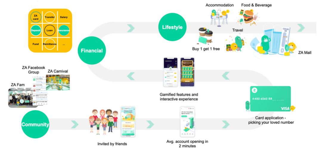 在内地互联网行业,拼多多、淘宝等平台的产品交互都在走向游戏化、快乐化、轻松化,让用户“边玩边用”,提高拉新效果、提升留存效率、提高活跃程度。众安银行也借鉴内地互联网电商平台们的实践经验,在虚拟银行的运营推广上进行了许多创新,在香港推出利是红包、支付激励、游戏积分、会员计划、商家优惠券等服务,用户支付后可“开盲盒”、“大转盘”等形式获得现金券、加息券、延期还款券等福利,就像玩儿游戏一样在ZA Bank App参与各种营销活动。