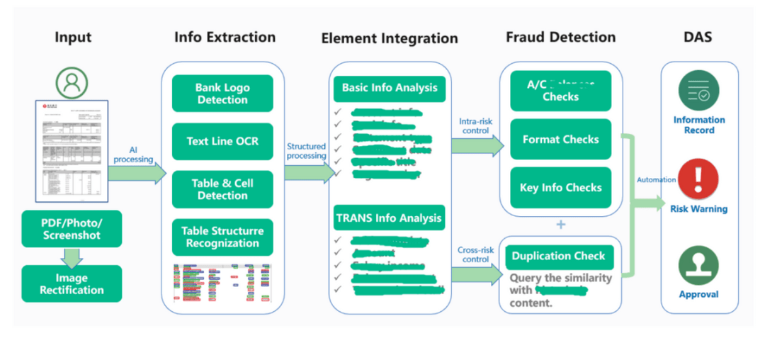 在贷款审批环节,众安银行利用AI技术进行风险探测与反欺诈识别,除了对部分文件进行CA证书与属性验证外,更多是基于OCR与NLP(自然语言处理)等AI算法以及辅助措施来智能鉴别不同银行、 不同版本的结单 PDF 和图片。从 2022年 4 月到 2023 年 03月众安技术团队已接入香港 5 家主流银行22 个结单模板,结单覆盖率 80%,月结单反欺诈检测识别率达到 92%, 且结单识别已逐步由人工半自动化转换成全自动化。