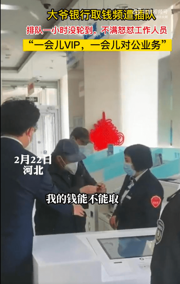 这几天偶然在手机上刷到一则短视频:河北一位大爷在银行取钱时频遭插队,一会来一个VIP,一会来一个公对公,结果1小时都没轮到他,大爷实在忍不住了,怒怼工作人员。
