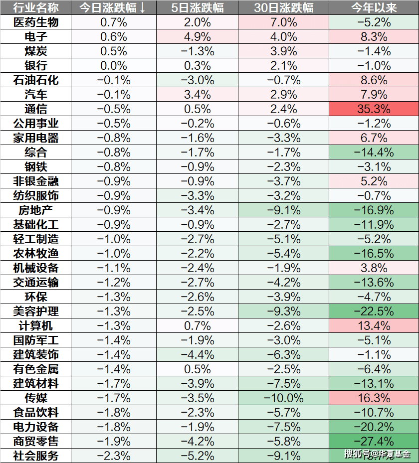 行业上来看,仅医药生物、电子、煤炭等板块上涨,社会服务、商贸零售、电子设备等板块下跌。