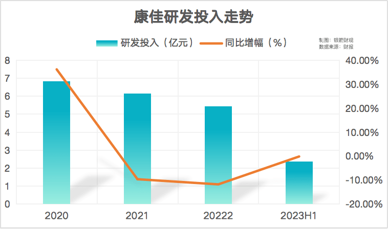 只是通过财报可以看到,在新战略发布之前,康佳对研发环节的重视,并没有展现出匹配“科技电子”转型期望的迹象。自2020年研发投入达到顶峰后,连续两年呈现下滑趋势,今年上半年虽然有所收窄,但仍处于负增长状态。