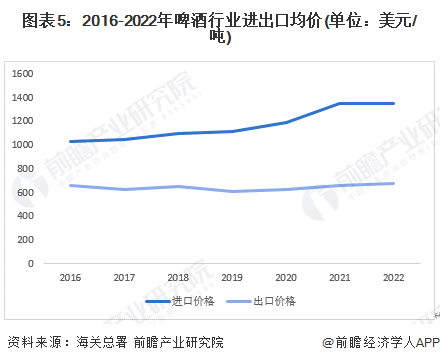2016-2022年,中国啤酒进出口之间的均价差距不断扩大。2016年,进口价格差距368.46美元/吨。2022年,进出口均价差异拉开到666.28美元/吨。从价格趋势来看,目前中国的进口主要以高端啤酒为主,而出口产品则以中低端啤酒居多。