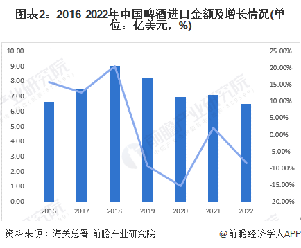 在进口金额方面,2016-2018年,进口金额不断上涨,2018年全年中国啤酒进口金额达到顶峰,为9.04亿元。此后四年,我国啤酒行业进口金额不断下跌,2022年,中国全年啤酒进口金额6.50亿美元,四年间跌幅最大可达15.24%。
