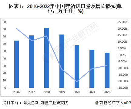 从2016年-2022年,中国啤酒的进口规模经历了上升再下降的过程。2016-2018年,中国啤酒进口规模不断扩大,于2018年达到顶点,进口量达82.11万千升。2018年以后,中国啤酒的进口规模逐年下降。到2022年,中国啤酒进口量下降至48.21万千升。