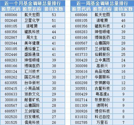 将时间周期缩短到最近一周(9月27日-10月13日)来看,基金调研数量第一的公司是航天宏图,属于互联网服务行业, 公司主要从事测绘服务;民用航空器(发动机、螺旋桨)生产;建设工程勘察;建设工程设计;互联网新闻信息服务;通用航空服务;国土空间规划编制,共被53家基金机构调研;然后被调研数量较多的股票是诺唯赞、键凯科技和坤恒顺维,分别接受46家、43家和39家基金机构的调研。
