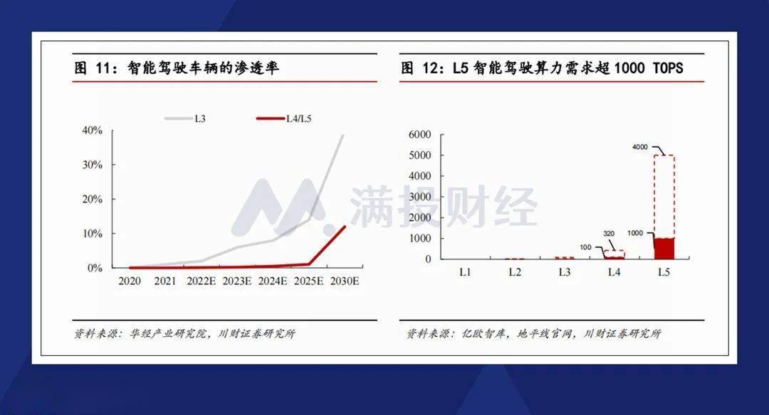 据华经产业研究院此前的预测,到2030年,我国L3、L5级智能驾驶的渗透率将会分别达到40%、12%。随着智能驾驶汽车渗透率的提升,将会持续带动智能驾驶市场整体算力需求的增加,预计2025、2030年智能驾驶市场算力需求达到1.9万、19万TOPS,2021-2025 CAGR达112%。