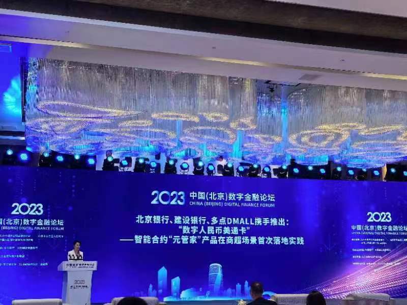 10月12日,在2023中国(北京)数字金融论坛上,北京银行推出数字人民币智能合约应用平台,携手建设银行、多点DMALL,共同研发推出首款商超领域的数字人民币预付资金管理产品(元管家)——“数字人民币美通卡”。