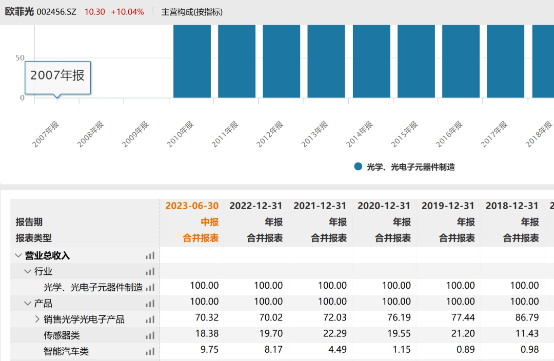 从欧菲光的营收结构上也能看到其改变。2018年,光学光电子产品、传感器产品和智能汽车类产品在欧菲光占的营收比重分别为86.79%、11.43%和0.98%;至今年上半年,该比例已经变为70.32%、18.38%和9.75%。