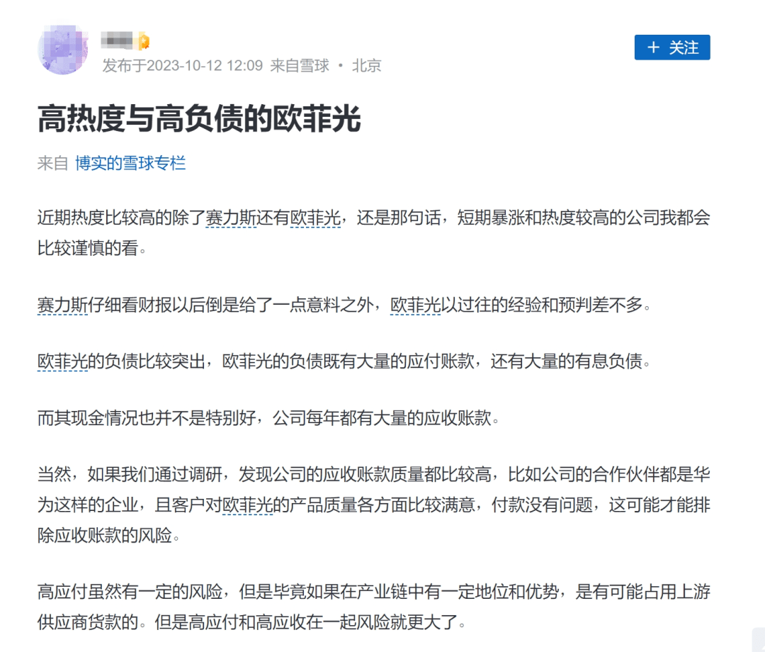 也有雪球用户认为,欧菲光现金状况并不是特别好,需要注意其高应付和高应收同时存在的风险。“如果通过调研,发现公司应收账款质量都比较高,才能排除风险;另外如果在产业链中有一定优势和地位,是有可能占用上游供应商货款的。但高应付和高应收在一起风险就大了。”