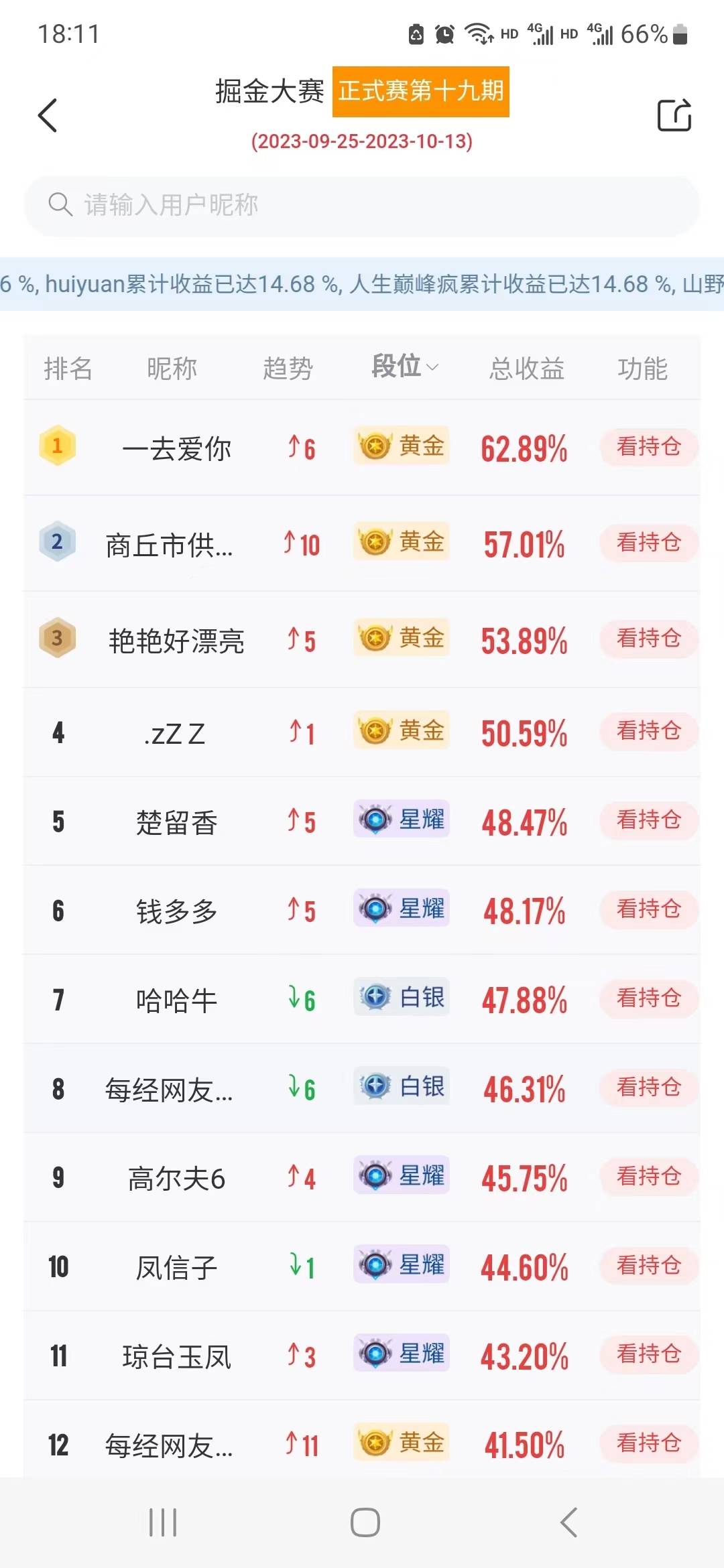 今日是本期比赛的最后一天,前十名的竞争非常激烈。在昨日第一名收益率44.02%,今日这样的收益率要排在第11名,可见比赛比较精彩激烈。冠军“一去爱你”收益率62.89%,高于昨日第一名收益率18.87个百分点。