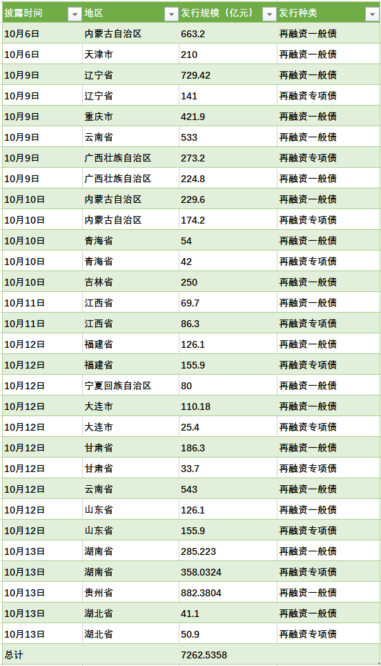 据澎湃新闻(www.thepaper.cn)统计,10月6日至10月13日,全国有17个省市披露拟发行特殊再融资债券,总额为7262.5358亿元。