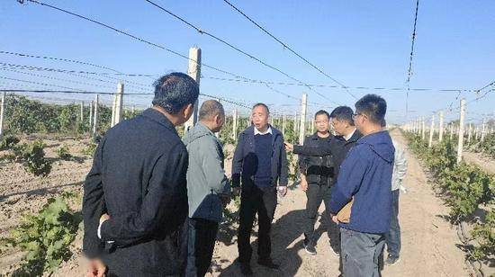 中新网兵团新闻10月12日电(李全山)10月10日,陕西天海水电集团董事长刘斌锋一行,来新疆生产建设兵团第八师一四九团实地考察水肥一体化项目。在一四九团禾创农业公司新品种鲜食葡萄示范基地,基地内主要种植鑫荣懋集团由国外引进的带有知识产权保护的优质新品种W3和B7两个品种,刘斌锋一行查看了两个新品种的长势,详细了解葡萄生长、水肥运筹等田间管理情况。政委康春迎、副团长杨永林、四级调研员董恒义陪同。
