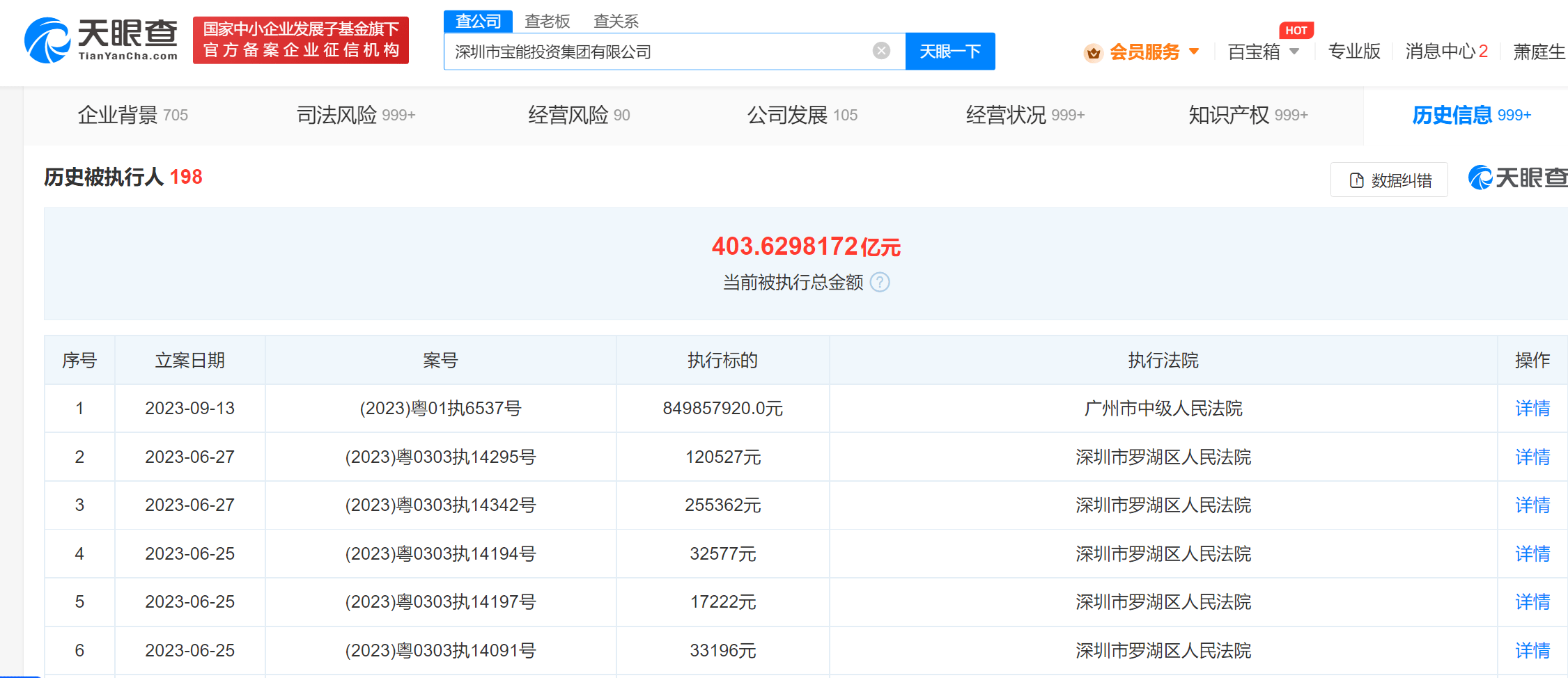 据天眼查,深圳市宝能投资集团有限公司当前执行总金额超403亿元。此外,该公司还存在多条限制消费令、失信被执行人(老赖)和终本案件信息。