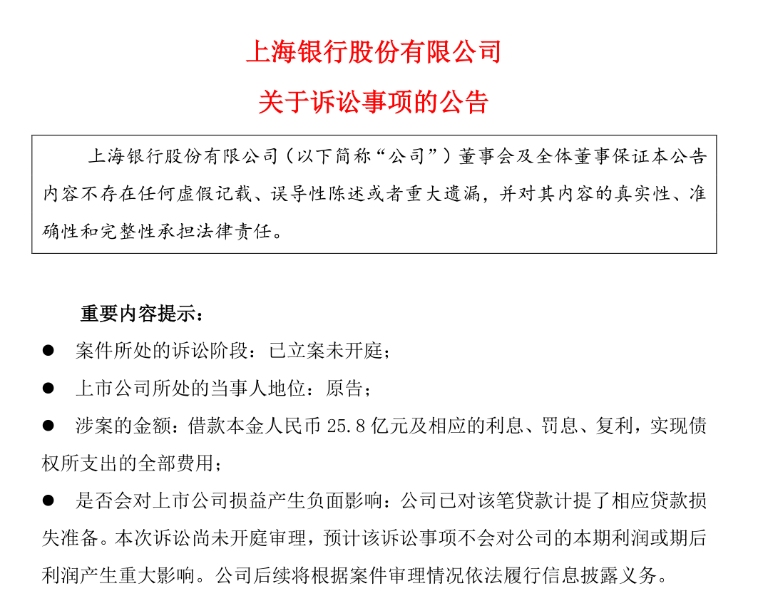 上海银行表示,已对该笔贷款计提了相应贷款损失准备。该诉讼尚未开庭审理,预计该诉讼事项不会对公司的本期利润或期后利润产生重大影响。