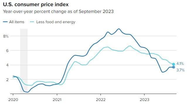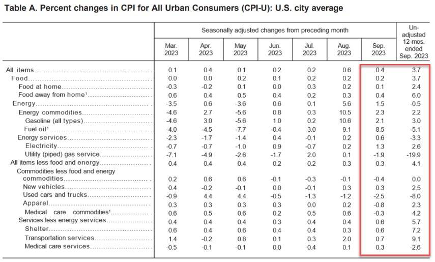 美国劳工部周四发布的报告显示,美国9月CPI同比增长3.7%,略高于预期3.6%,前值3.7%。美国9月核心CPI同比增长 4.1%,与预期一致,前值4.30%。美国9月CPI环比增长 0.4%,预期0.30%,前值0.60%。美国9月核心CPI环比增长 0.3%,与预期一致,前值0.30%。