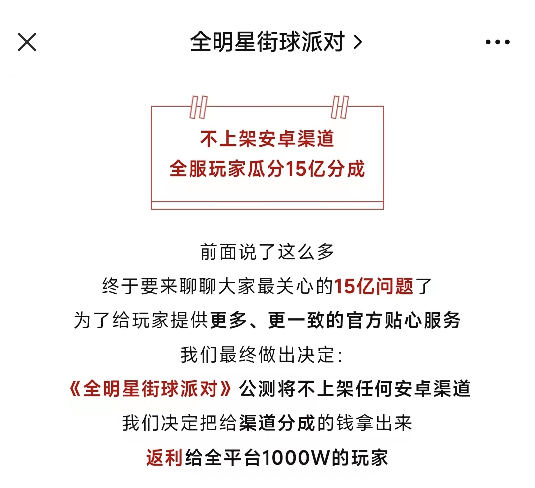 摆在台面之上的纷争还要更大。例如最近的网易黑马《全明星街球派对》,原计划登录各大商店渠道,却在上线前突然取消。在游戏上线之初的推广中,官方称要将原本会被渠道分走的15亿返利给所有玩家。据悉,这一决定并非来自团队内部,而是网易高层的授意。