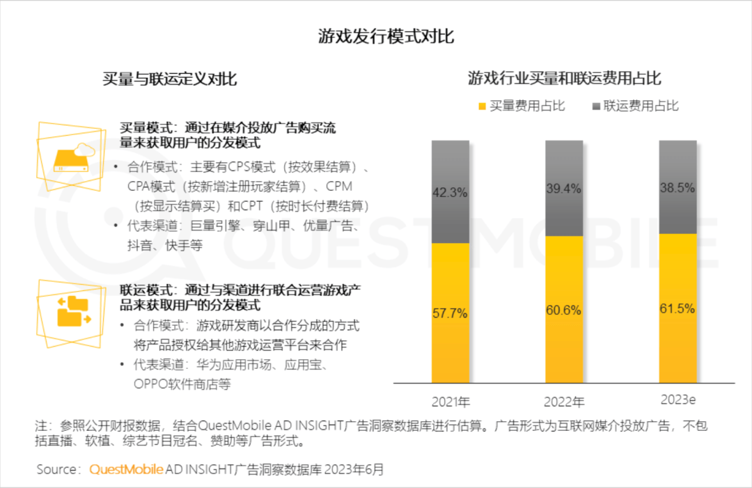 据QuestMobile分析报告显示,近年来游戏厂商在广告买量上投入的费用,已经超越在联运模式中的投入,成为主流发行模式,且近年来占比越来越大。