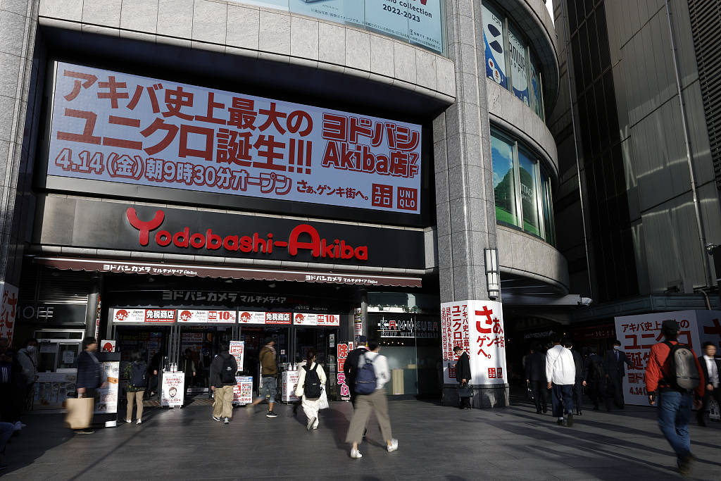 当地时间2023年4月13日,日本东京,Yodobashi Akiba大厦,屏幕上显示由迅销公司运营的优衣库门店开业广告。视觉中国 资料图
