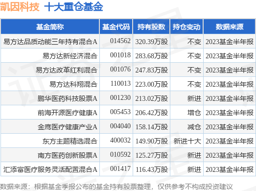 重仓凯因科技的前十大公募基金请见下表: