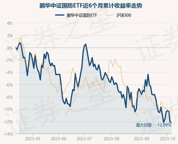 证券之星消息,10月12日,鹏华中证国防ETF最新单位净值为0.7259元,累计净值为1.4518元,较前一交易日下跌0.14%。历史数据显示该基金近1个月下跌6.26%,近3个月下跌9.43%,近6个月下跌12.19%,近1年下跌21.21%。该基金近6个月的累计收益率走势如下图: