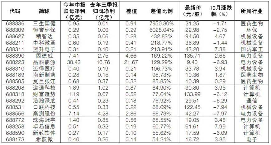 需要注意的是,由于科创板三季报预告情况采取自愿性披露,因此部分业绩向好公司并未显示。记者依据今年中报归母净利为正、去年三季报归母净利为正,且今年中报归母净利大于去年三季报为标准,剔除已经预告的公司,筛选出19家公司三季报预增概率较大。记者 刘扬