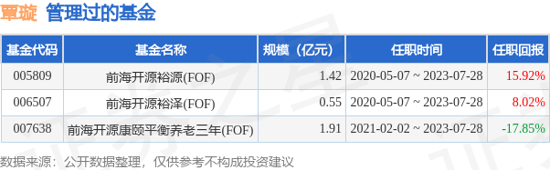覃璇先生:中国国籍,北京大学硕士研究生。历任中国银行软件中心信贷业务部软件工程师、北京京北方科技软件工程师、南方基金交易管理部交易员,2015年12月加入前海开源基金,现任FOF投资部基金经理。曾任前海开源康颐平衡养老目标三年持有期混合型发起式基金中基金(FOF)基金经理、前海开源裕源混合型基金中基金(FOF)基金经理。2020年5月7日至2023年07月28日担任前海开源裕泽定期开放混合型基金中基金(FOF)基金经理。
