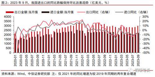 2023年9月,我国出口同比增速主要在基数走弱叠加外需边际好转的影响下有所回暖,国内需求呈边际改善一定程度支撑进口同比跌幅改善。往后看,去年四季度我国出口同比增速转负,基数效应的进一步趋弱或支撑今年四季度出口同比有所好转,但考虑到外需整体的压力,预计出口绝对水平的修复仍需时间。