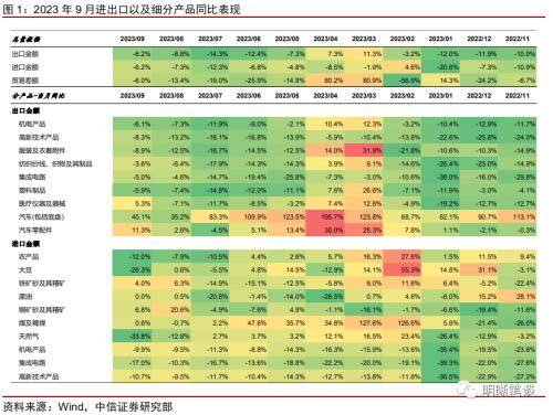 9月我国进口(以美元计价)同比下降6.2%,wind一致预期降5.7%,尽管进口同比跌幅较上月有所收敛,但幅度略低于预期。(1)大宗商品方面:9月份,制造业采购经理指数(PMI)为50.2%,比8月上升0.5pct,时隔半年重返扩张区间。9月PMI主要指标显示,制造业生产较快扩张,需求温和改善。体现在进口层面,大豆的进口数量有所下行,煤及褐煤、原油、铁矿砂的进口数量分别录得28%、1%和14%的同比增速;铜矿砂和天然气的进口数量与去年同期水平基本持平。价格方面,包括大豆、原油、煤及褐煤在内的部分大宗商品进口单价仍为同比负增长,但较上月有所修复;铁矿砂和铜矿砂的进口单价同比录得正增长。(2)集成电路方面:地缘政治因素的扰动下,我国大陆集成电路的进口延续跌势,对应中国大陆从韩国、日本、中国台湾进口的同比显著下跌,但内需的边际改善仍在一定程度上为相关商品进口提供支撑。展望后续,国内需求呈边际改善一定程度支撑进口数量增长,同时多数大宗商品价格的基数逐步进入下行区间,因此价格因素对进口的拖累或逐步消退,因此预计2023Q4的进口增速或较上半年逐步修复。