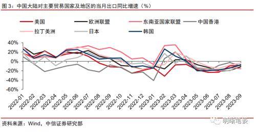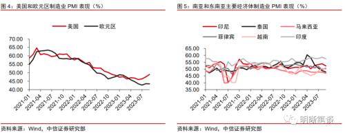 2023年9月,中国大陆对主要贸易伙伴的出口表现虽仍是同比下跌,但跌幅出现不同程度收窄。分国家和地区来看:(1)中国大陆对美国出口同比增速录得-9.3%,较8月读数环比提升0.2个百分点。自去年8月起,中国大陆对美国出口同比增速进入负增长阶段,因此基数较低。此外,美国2023年9月制造业PMI读数较8月明显提升,同期红皮书商业零售销售周同比增速中枢也有所上移,或也在一定程度上反映其需求的相对韧性。(2)中国大陆对欧盟出口同比录得-11.6%,较8月接近20%的跌幅相比改善幅度明显。(3)尽管外需边际改善,但去年同期中国大陆对东盟的出口同比近30%的增速导致较高的基数。因此,2023年9月中国大陆对东盟出口同比下降15.8%,较8月的跌幅小幅走阔近1.5个百分点。(4)中国大陆对拉丁美洲、非洲和俄罗斯等新兴市场的出口同比分别录得-3.7%、-3.1%和21%,为我国出口贡献一定支撑。