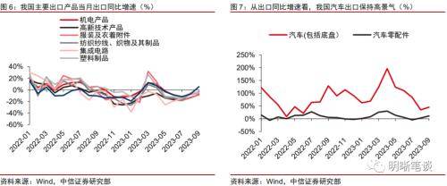 贸易产品方面,9月大部分重点商品的出口金额同比跌幅边际好转,汽车出口的结构性亮点仍存。分产品看:(1)机电产品——9月的出口金额同比下跌6.07%,较8月跌幅收窄近1.2个百分点。细分商品方面,家用电器、汽车(包括底盘)、汽车零配件实现同比增长;美国9月制造业PMI环比回升、欧元区9月制造业PMI跌幅收敛,海外生产需求的边际变化支撑通用机械设备、自动数据处理设备及其零部件等商品的出口金额同比跌幅有所改善。(2)轻工制品中,包括鞋靴、服装、纺织原料、玩具、家具等商品出口的同比跌幅较8月读数进一步收敛。(3)高新技术产品出口同比读数录得-8.26%,较8月读数出现近5个百分点的明显改善。