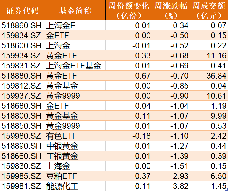 商品ETF本周涨跌互现,除上海金E小幅上涨外,其余品种集体下跌。能源化工ETF跌近4%、豆粕ETF跌近3%;黄金相关ETF普跌约1%。