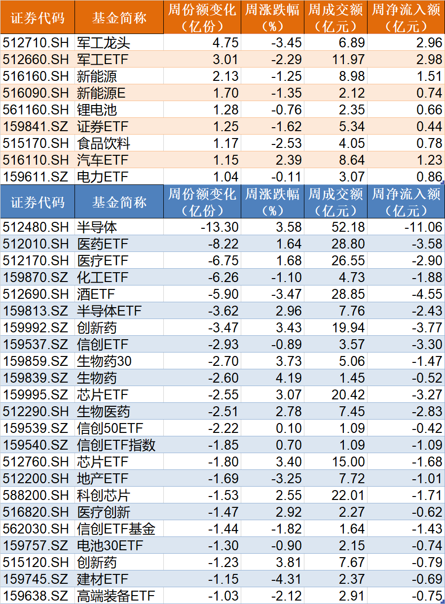 行业主题上看,军工、新能源相关ETF被资金抄底,而半导体、医药ETF被资金抛售。