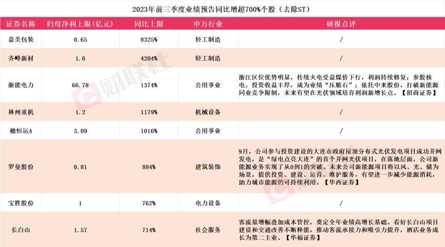 2023年前三季度业绩同比预增最高超700%的个股及最新券商研报点评
