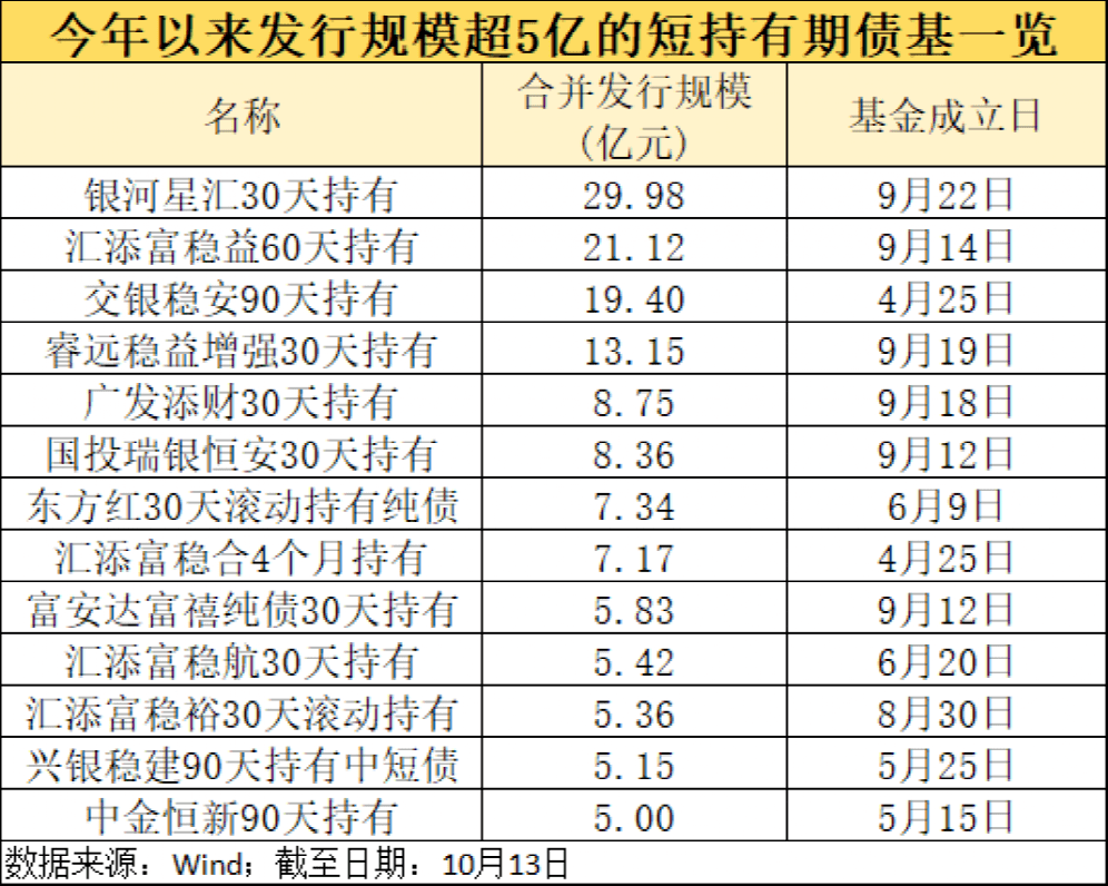 Wind数据显示,截至10月13日,年初以来共有65只设置持有期的债券基金成立,其中持有期为30天、60天、90天、120天的债券基金合计28只,绝大多数为纯债产品,另有两只二级债基。