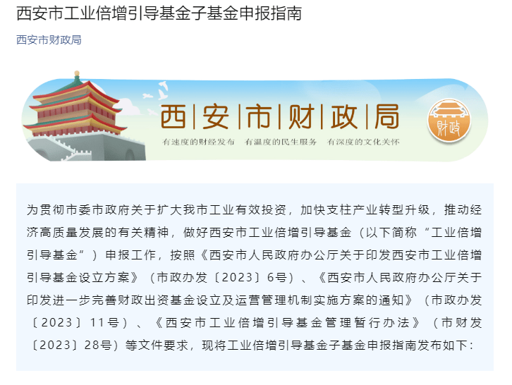 为加快推动西安市产业转型升级、壮大成势,西安市工业倍增引导基金子基金申报指南(以下简称《申报指南》),于近日正式发布。