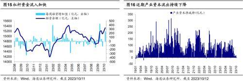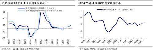 资本市场方面,随着活跃资本市场政策持续出台,市场的信心正边际回暖,资金的供求关系已出现改善,例如近期内资中杠杆资金已率先加速入场,9月以来其净流入趋势已由负转正,截至10/12累计净流入规模已达557亿元。此外自证监会优化IPO、再融资监管,规范股份减持行为,证券交易印花税实施减半征收等政策措施出台以来A股的资金流出压力已边际缓解,如9月产业资本流出仅为61亿元,较8月的199亿元明显下降。此外,10月11日工商银行、农业银行、中国银行、建设银行分别发布公告称,接到控股股东中央汇金投资有限责任公司(简称“汇金公司”)通知,汇金公司于2023年10月11日通过上海证券交易所交易系统增持其A股股份。汇金公司拟在未来6个月内(自本次增持之日起算),以自身名义继续在二级市场增持其股份。本次中央汇金的增持起到提振A股信心作用,良好践行了政治局会议指出的“活跃资本市场,提振投资者信心”要求,后续或有望带动更多增量资金入场。往后看,随着我国稳增长政策继续落地,我国经济有望持续回升,我们预计全年GDP同比增速有望达5.3%。在经济回暖的背景下,我们预计Q2-Q4 A股盈利将稳步复苏,23年全A归母净利润同比增速有望接近5%。在基本面逐步复苏的背景下,投资者信心及风险偏好进一步修复,催化A股第二波行情展开。