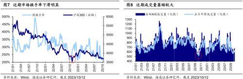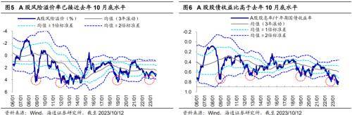 从交易及资产比价等指标来看,市场情绪和风险偏好同样较低。近期市场出现低波动的背后是投资者情绪和风险偏好的走弱,例如从交易指标看,近一段时间交易热度明显下滑,部分指标显示当前市场情绪已接近去年10月底水平。从周换手率看,周换手率于5月初开始回落,当前(截至2023/10/12,下同)周换手率(年化)为235%,低于22/10市场底部时的276%。从成交情况看,全部A股五日平滑成交量已从5月初的高点回落,当前全A五日平滑成交量为630亿股,低于去年10月底时市场成交量695亿股。从整体估值看,尽管当前多数指数估值水平与同为底部区域的去年10月底相比仍有一定差距,但也都回到历史低位。截至2023/10/12,全部A股PE(TTM,下同)为17.4倍、处05年以来33%分位(22/10/31为15.8倍、23%),上证综指为13.1倍、32%(11.4倍、13%),沪深300为11.6倍、22%(10.3倍、11%)。从大类资产比价指标看,股市情绪已明显较弱。截至2023/10/12(下同),当前A股风险溢价率(1/全部A股PE-10年期国债收益率)为3.11%、处05年以来从高到低24%分位,已经高于05年以来均值+1倍标准差(3年滚动);当前A股股债收益比(全部A股股息率/10年期国债收益率)为0.80、处05年以来从高到低1%,达05年以来均值+2倍标准差(3年滚动)附近,接近去年10月底水平,可见当前市场的风险偏好已处在低位。