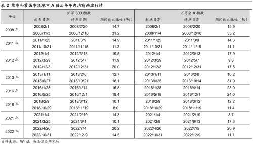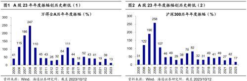 参考历史A股年内行情波动规律,历年至少存在两波上涨行情。如前所述,对比历史来看当前A股的波动已明显较低,而从历史经验来看低波动并非A股的常态,后续指数振幅将有望扩大,也即年内指数或有望出现新高或新低。而我们在前文分析过,当前无论是估值还是对比债市的比价指标均显示A股已经处于高性价比区间,即当前底部区域已较扎实。实际上,在A股历史上哪怕是震荡市或者熊市期间,年度视角下依然存在至少两次10%以上涨幅的机会。例如,在2008年、2011年、2018年和2022年这四个明显较弱的自然年度内A股在年初和年末依然存在两次投资机会,并且两次上涨行情中宽基指数的涨幅基本都超过10%;此外像2012年、2013年、2016年和2021年这四个全年宽基指数涨跌幅在10%左右的震荡行情中,对应年份中A股也同样存在两波的明显上涨行情,详见表2。而反观今年,截至2023/10/13年内仅有一波行情,包括去年10月底至今年1月底的整体性行情,以及今年2月至5月初的结构性行情,因此结合历史规律我们认为后续A股有望迎来年内第二波机会。