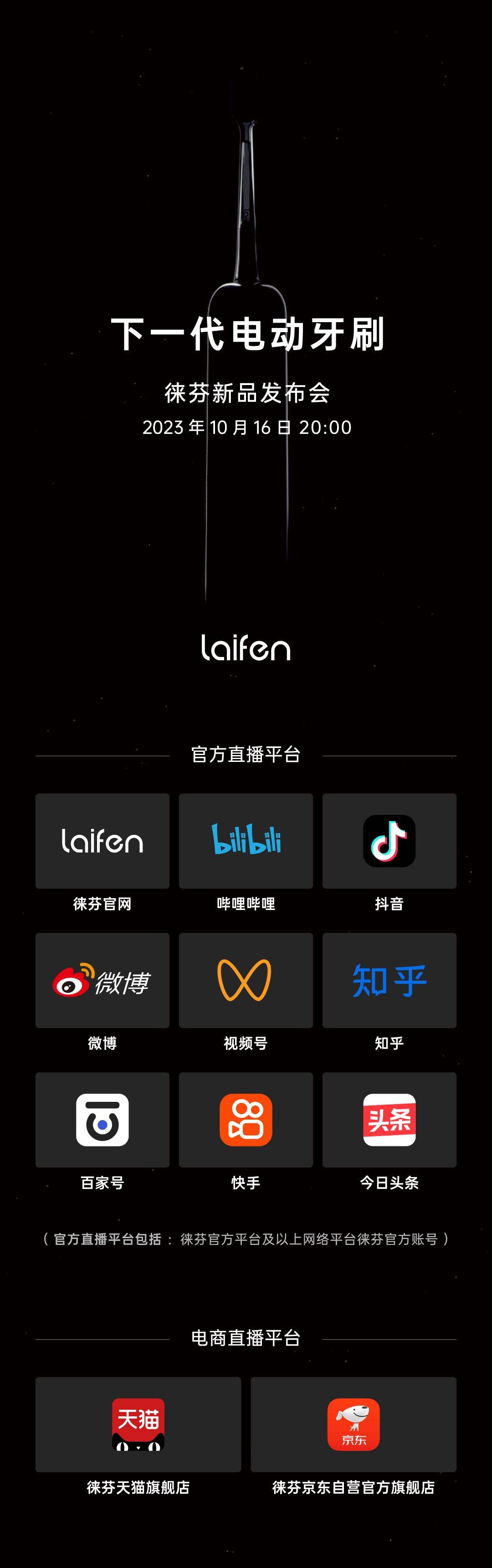 每一个奖项的背后,都是徕芬用产品品质收获来的市场认可,每一次企业的进步,都象征着国货品牌在国人心目中的崛起。而徕芬自身的技术积累,也让研发团队能更快更有信心地投进技术创新。据悉,10月16日晚20:00,徕芬正式官宣将举办新品发布会,推出全新品类,号称 “下一代电动牙刷”。