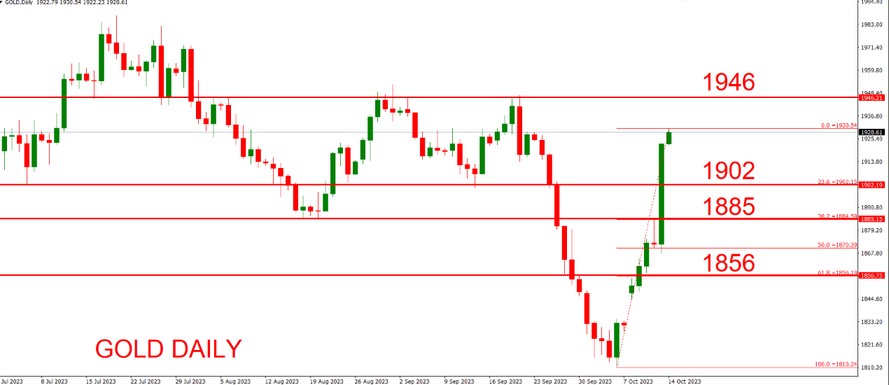 周五(10月13日)欧洲交易时段,以色列给出24小时的最后期限,要求加沙的所有平民撤离该市并迁移到南部,这被市场解读为局势升级的信号,市场避险情绪重新席卷,欧美股市跌幅扩大,债市获得追捧,黄金短线暴拉20美元,原油狂飙超4%,中东恐慌令投资者倾向于在周末前寻求庇护。美国周五宣布收紧对俄罗斯原油出口的限制,受此影响,油价反弹。一些分析师指出,油价如果持续上涨,可能会增加黄金的避险买盘,以对冲顽固的通胀。