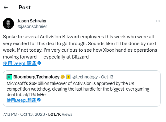 IT之家10 月 15 日消息,彭博社记者 Jason Schreier 周五在 X 平台(原推特)发文称,本周自己与动视暴雪的数名员工进行交谈,他们对这笔交易的达成“都感到非常兴奋”。