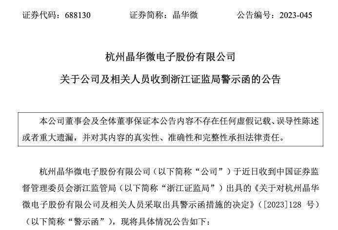 10月13日晚间,晶华微(688130.SH)发布公告称,因多项违规行为,公司及董事长吕汉泉、总经理罗伟绍、时任财务总监兼董秘周荣新等责任人被浙江证监局出具警示函。