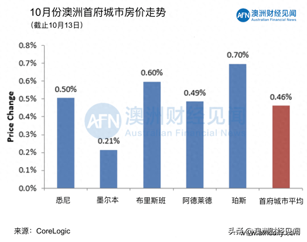 澳大利亚房价继续上涨,CoreLogic每日房价指数显示,10 月份迄今在这 5 个城市上涨了 0.46%。