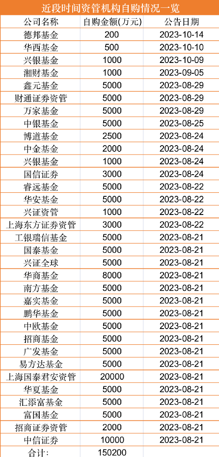 事实上,今年8月底以来,资管机构开启了一波密集自购潮,包括易方达、华夏、广发、富国在内33家机构陆续宣布自购旗下公募基金,合计金额超过15亿元。