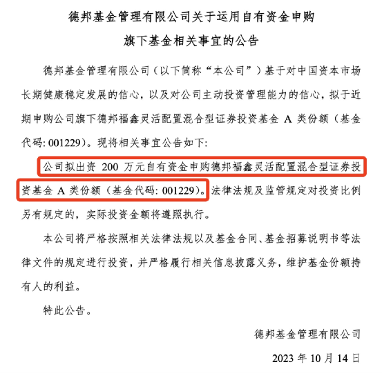 10月14日,德邦基金公告,基于对中国资本市场长期健康稳定发展的信心,以及对公司主动投资管理能力的信心,公司拟出资200万元自有资金申购德邦福鑫灵活配置混合型基金A类份额。
