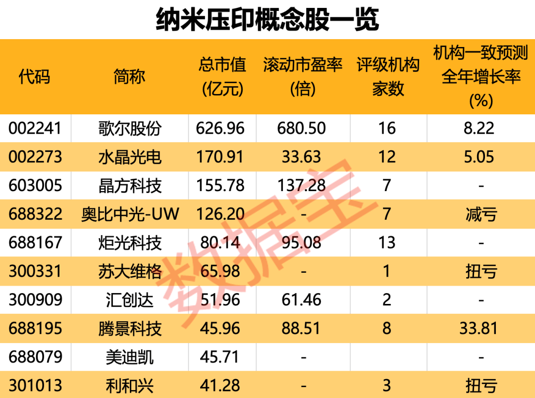 据证券时报·数据宝梳理,A股市场中,布局纳米压印相关业务的个股约有10只。歌尔股份市值居首,为626.96亿元;水晶光电、奥比中光-UW、晶方科技3股最新市值均超过100亿元。