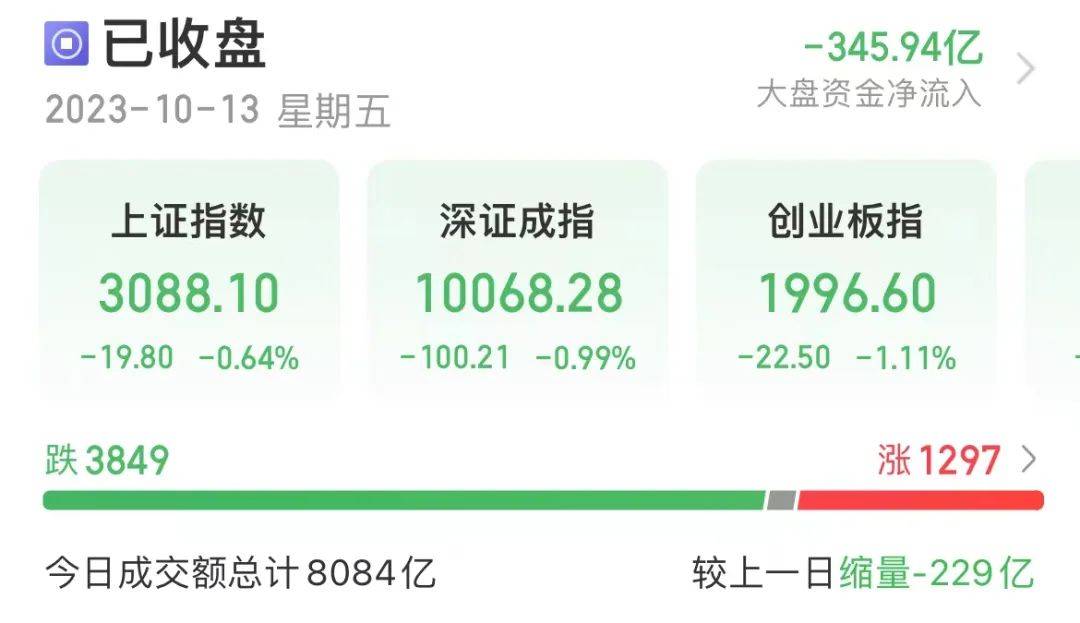 10月13日,三大指数集体收跌。截至收盘,沪指跌0.64%,深成指跌0.99%,创业板跌1.11%。个股跌多涨少,两市逾3800股飘绿。
